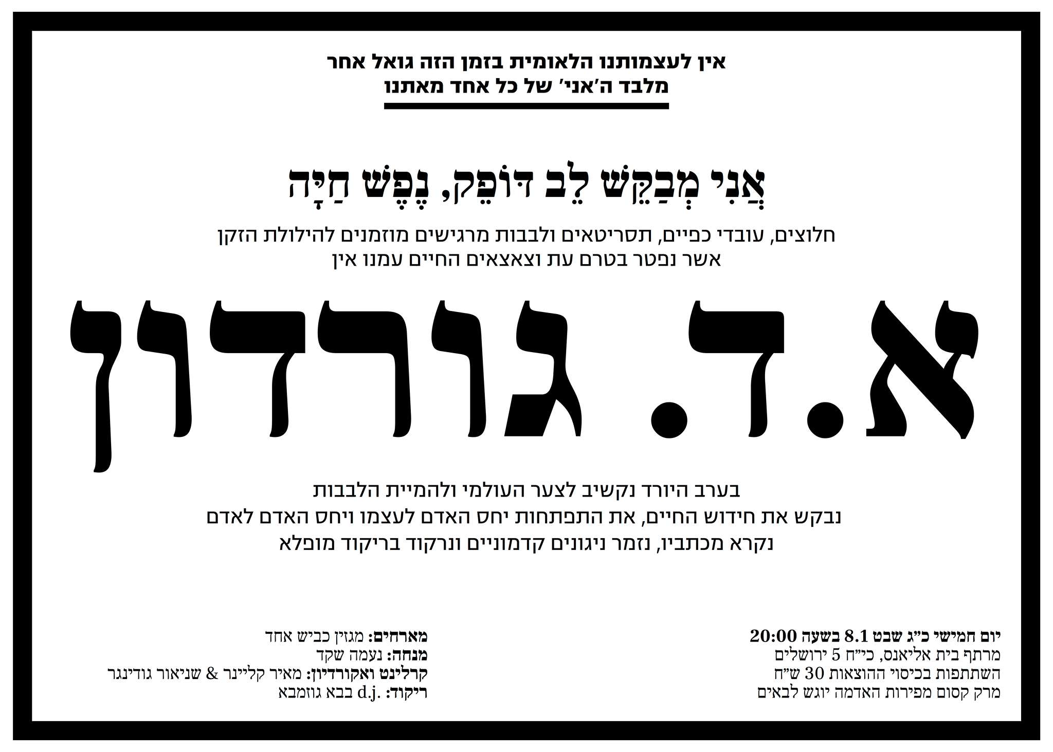 חלוצים, עובדי כפיים, תסריטאים ולבבות מרגישים מוזמנים להילולת הזקן אשר נפטר בטרם עת וצאצאים החיים עמנו אין