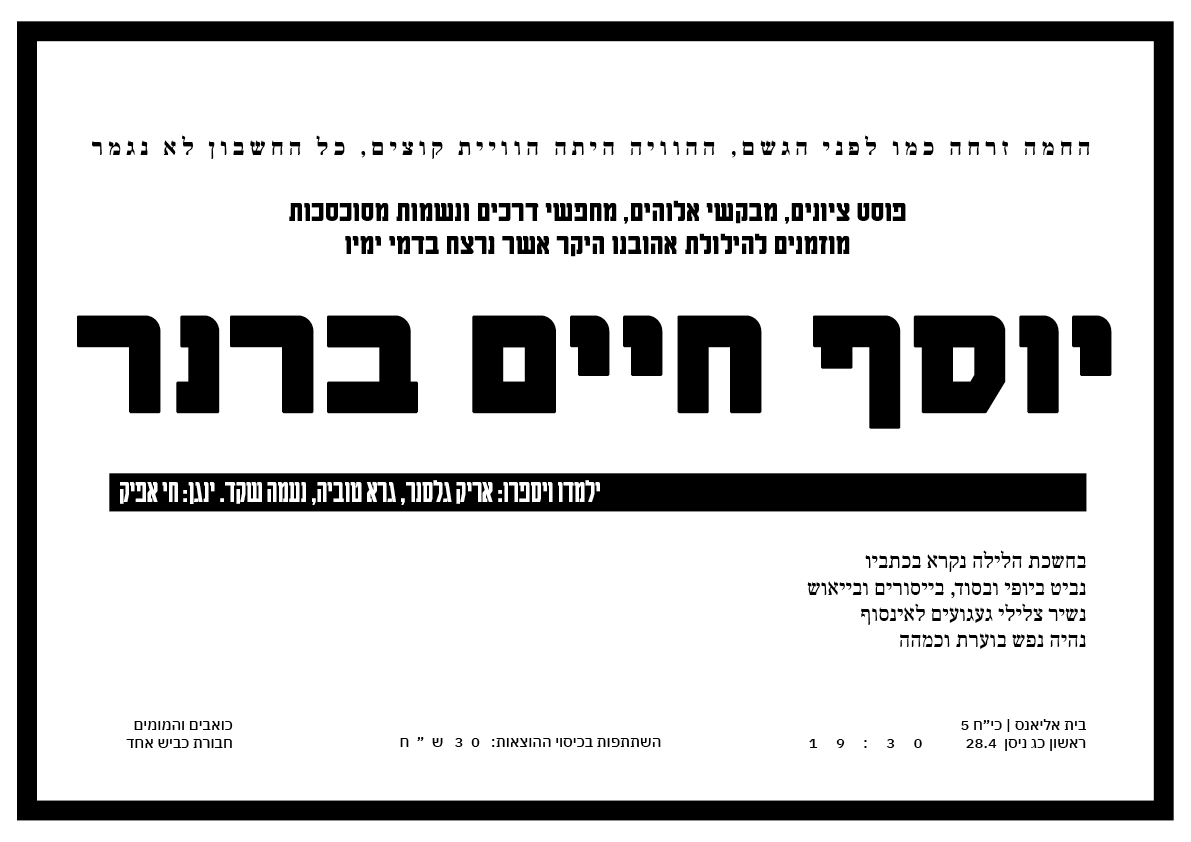 ראשון כ"ג ניסן 28.4 בשעה 19:30